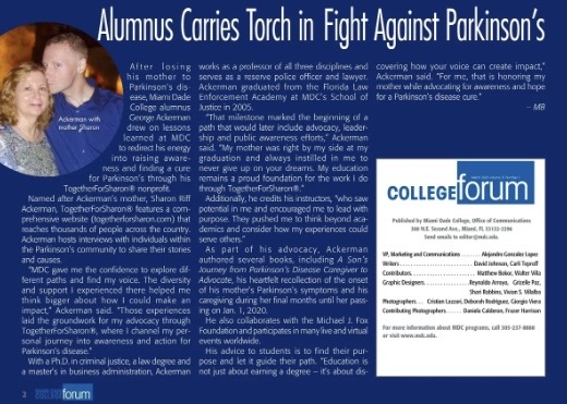 – My main focus in life today is Parkinson’s disease awareness and hope for a cure in my mother, Sharon Riff Ackerman’s memory.